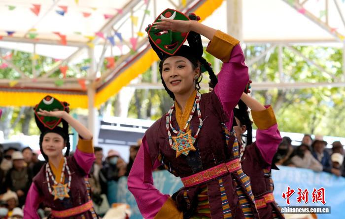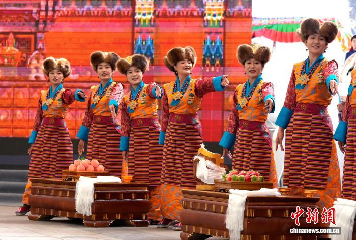 10月19日,“格?;ū崩_市第六屆縣(區(qū))藝術團文藝調演頒獎活動在布達拉宮腳下的宗角祿康公園舉行?,F(xiàn)場,拉薩市各縣(區(qū))藝術團帶來精彩節(jié)目。圖為文藝調演頒獎活動上的文藝表演。中新社記者 李林 攝