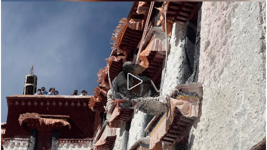 布達(dá)拉宮迎來了一年一度的“煥新”計(jì)劃,來自布達(dá)拉宮管理處的專業(yè)人員,與當(dāng)?shù)孛癖姟嵝闹驹刚邆児餐度氲竭@場“年度美容”工程中,為這座擁有千年歷史的古老宮殿披上潔白莊嚴(yán)的“新衣”。參與涂墻的民眾,身上、頭發(fā)上都沾滿了白色的涂料,仿佛落了一層細(xì)雪。同時(shí),一桶桶涂料被有序地傳送并潑灑在墻面上,布達(dá)拉宮這座屹立千年的宮殿在陽光下也愈發(fā)明亮。除此之外,大昭寺、色拉寺等大大小小的寺廟及民居的房屋也會(huì)開始粉刷,這一工作將在藏歷九月二十二日之前完成。