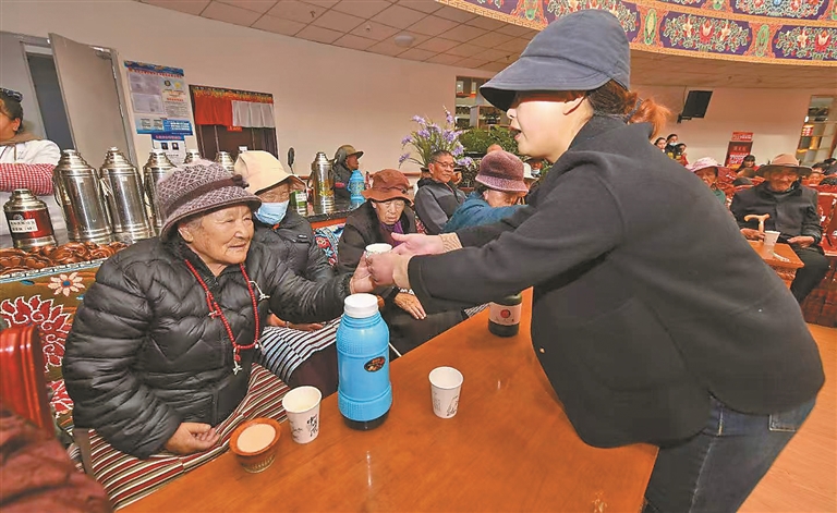 拉薩市福利院的工作人員為老人端上熱騰騰的酥油茶。記者 唐斌 攝