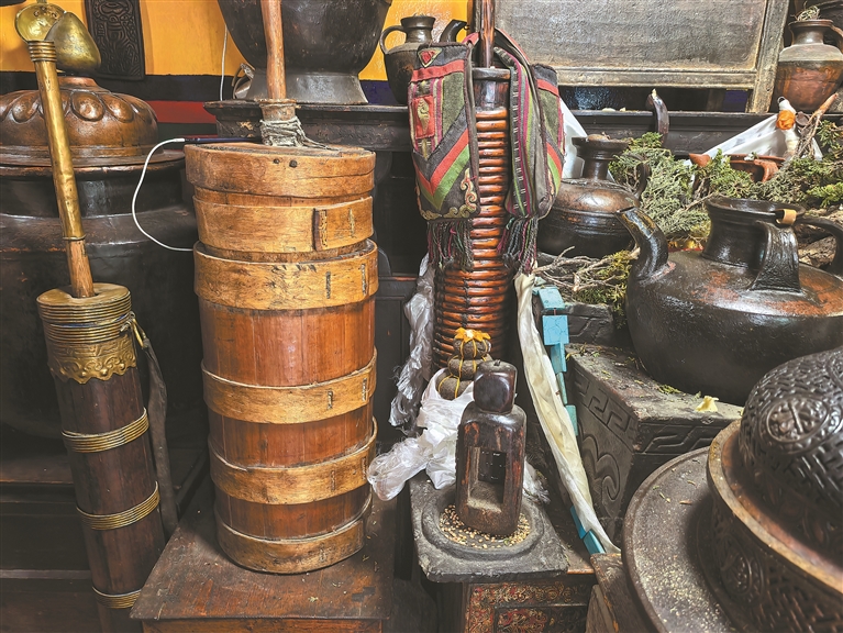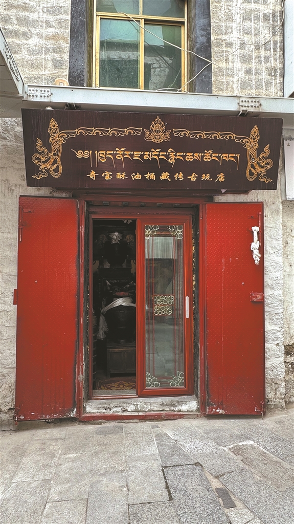 在八廓街,記者看到一家名為“奇寶酥油桶藏傳古玩店”的店鋪,店內(nèi)空間不大,卻擺放著滿滿當(dāng)當(dāng)?shù)摹皩氊悺薄魇礁鳂拥膫鹘y(tǒng)酥油桶、老式酥油茶壺、老式酸奶桶……像一座小小的主題博物館,展示著高原人民的勤勞與智慧。