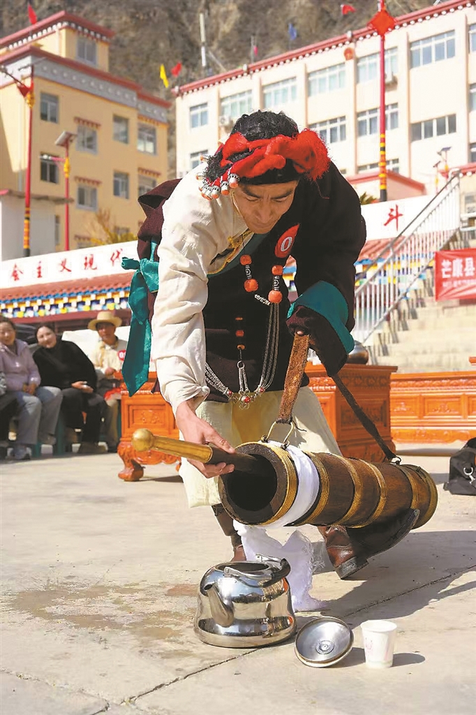 扎西曲登社區(qū)112號(hào)民宿主人為游客們倒酥油茶。記者 洛桑 唐斌 旦增蘭澤 攝