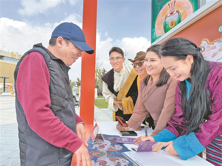 “萬人墨竹探親游”活動(dòng)的探親證發(fā)放處人潮擁擠,排隊(duì)申請領(lǐng)證的市民絡(luò)繹不絕。“我們準(zhǔn)備了1萬本免費(fèi)發(fā)放的探親證,探親證上詳細(xì)介紹了紅色文化游、藍(lán)色康養(yǎng)游、綠色生態(tài)游、文化探秘游、墨竹深度游精品線路的詳細(xì)內(nèi)容供大家選擇。屆時(shí),我們將準(zhǔn)備好香甜的青稞酒、潔白的哈達(dá)、美味的藏餐等候咱們南京的兄弟姐妹回雪域高原的墨竹家中看看、坐坐。”墨竹工卡縣文化旅游公司負(fù)責(zé)人扎西措姆在探親證發(fā)放現(xiàn)場介紹道。