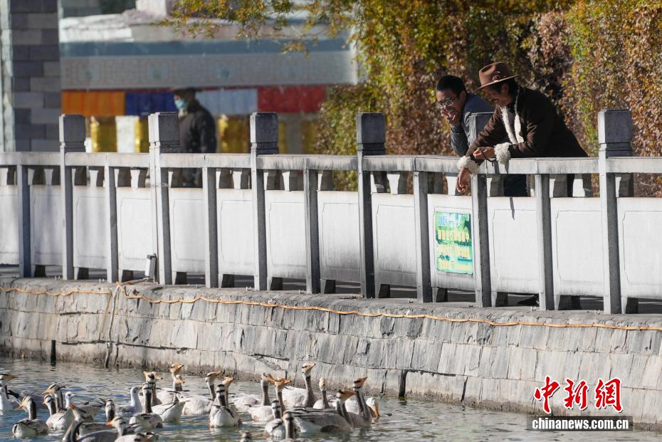 11月17日,西藏拉薩迎來大批越冬候鳥。拉薩河、宗角祿康公園等地,成為了它們的棲息天堂。在宗角祿康公園內(nèi),赤麻鴨、斑頭雁成群結(jié)隊,時而低頭覓食,時而水中嬉戲。它們的身影引得市民和游客紛紛駐足觀賞、拍照留念,構(gòu)成了一幅人與自然和諧共生的美麗畫卷。圖為市民在宗角祿康公園內(nèi)投喂候鳥。貢確 攝