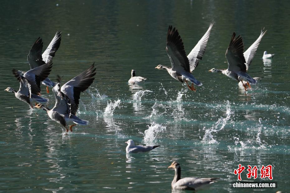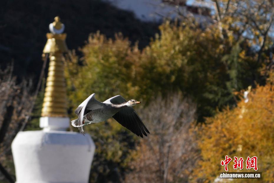 11月17日,西藏拉薩迎來大批越冬候鳥。拉薩河、宗角祿康公園等地,成為了它們的棲息天堂。在宗角祿康公園內(nèi),赤麻鴨、斑頭雁成群結(jié)隊,時而低頭覓食,時而水中嬉戲。它們的身影引得市民和游客紛紛駐足觀賞、拍照留念,構(gòu)成了一幅人與自然和諧共生的美麗畫卷。圖為斑頭雁從宗角祿康公園上方飛過。貢確 攝