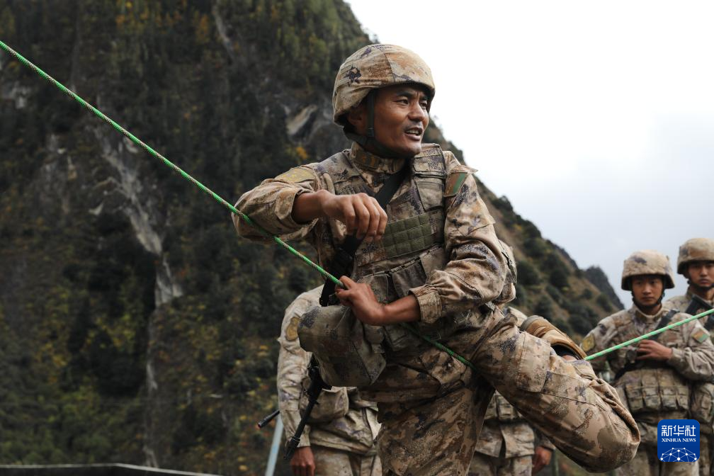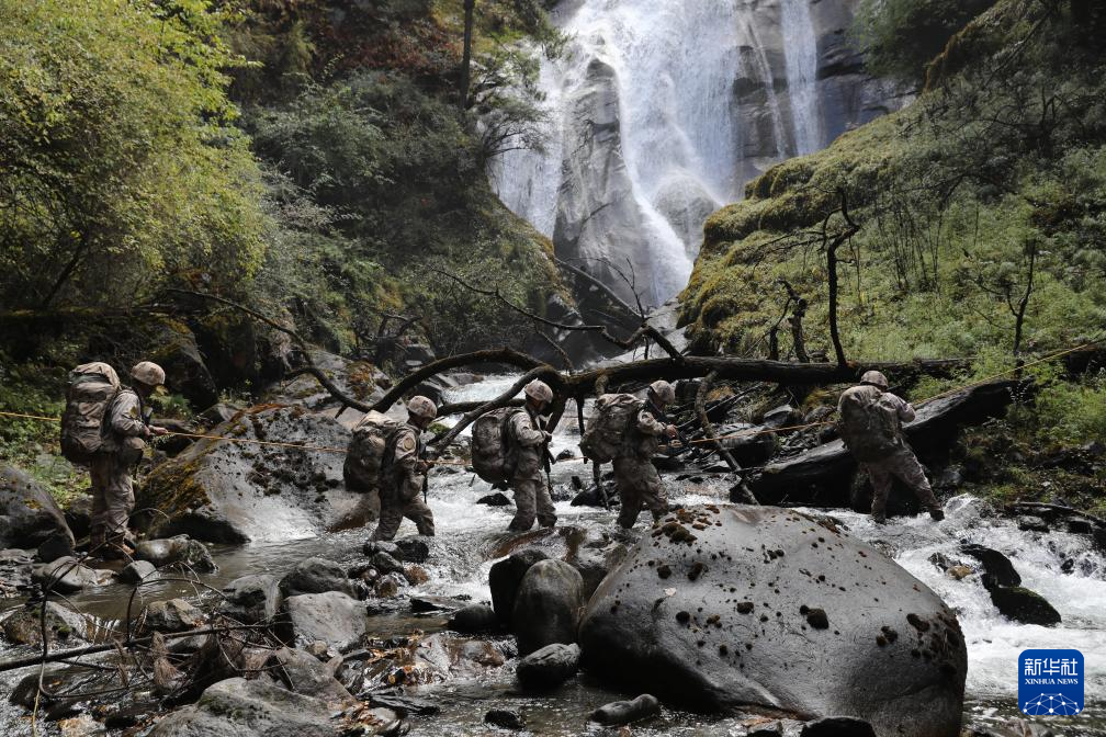 2025年11月2日,巡邏途中,西藏軍區(qū)某團(tuán)一級上士次羅布(右一)和戰(zhàn)友們跋山涉水。新華社發(fā)(于達(dá) 攝)