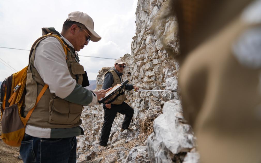 普查隊員在西藏墨竹工卡縣曲果崗塔群遺址現(xiàn)場開展數(shù)據(jù)采集。(2024年4月11日 攝) 新華社記者 晉美多吉 攝