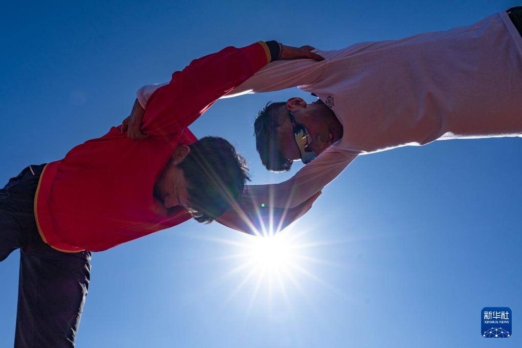 12月2日,索南加參(右)在西藏自治區(qū)競技體育管理中心和隊(duì)友一起拉伸。新華社記者 丁增尼達(dá) 攝