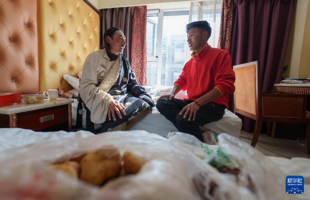12月5日,索南加參(右)在拉薩的酒店房間中和父親次仁多杰聊天。新華社記者 丁增尼達(dá) 攝