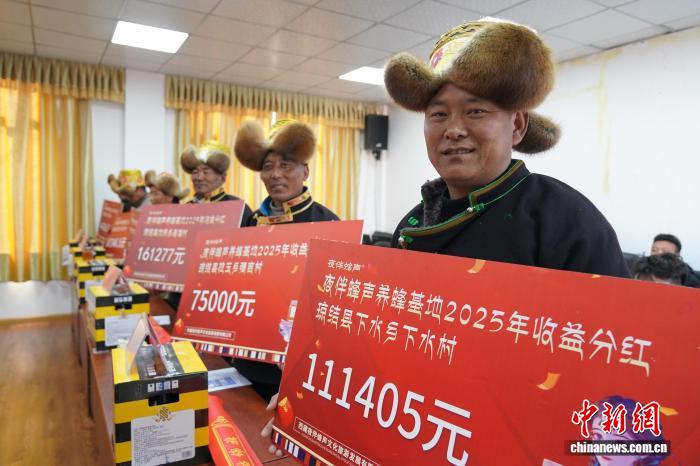 瓊結(jié)縣拉玉鄉(xiāng)強(qiáng)吉村黨總支書記、村委會主任赤列旺久反復(fù)數(shù)著一疊又一疊的現(xiàn)金說:“今年分紅75000元。相較于出遠(yuǎn)門打工掙錢,在家門口養(yǎng)蜂更踏實(shí),收益更好。”