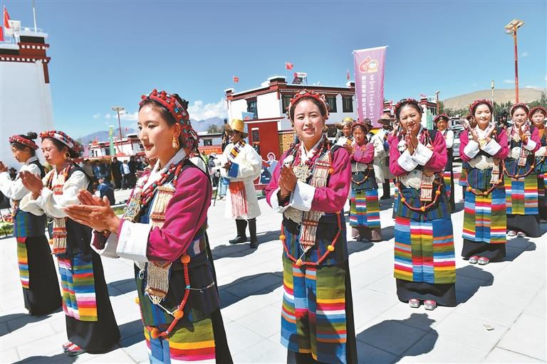 定日縣森嘎村身著盛裝的群眾慶祝喜遷新居。西藏日報記者 王敏 攝