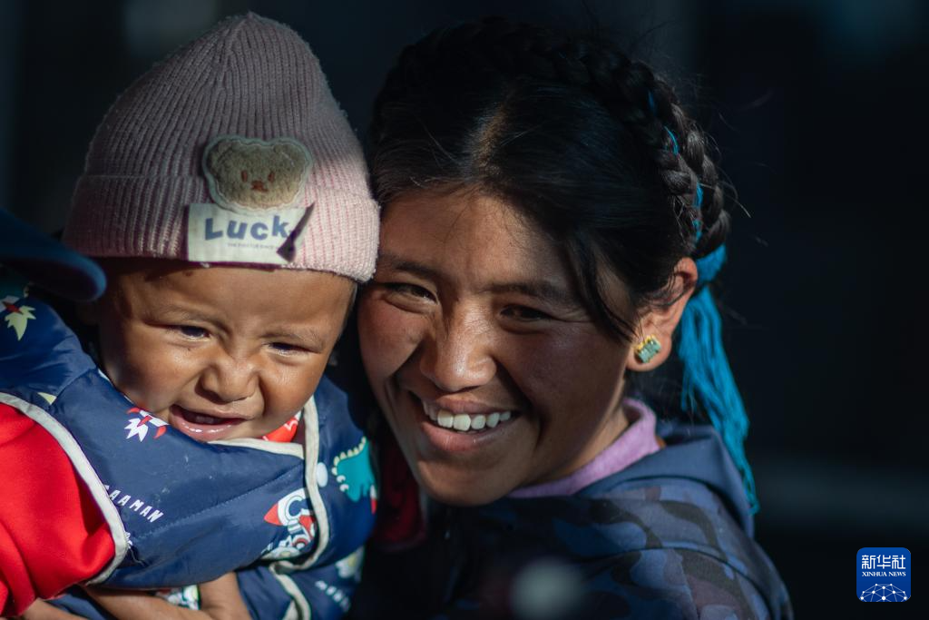 2025年11月11日,在西藏定日縣長所鄉(xiāng)雜村,母親朋瓊在剛裝修好的新房中抱著次仁拉巴。新華社記者 姜帆 攝