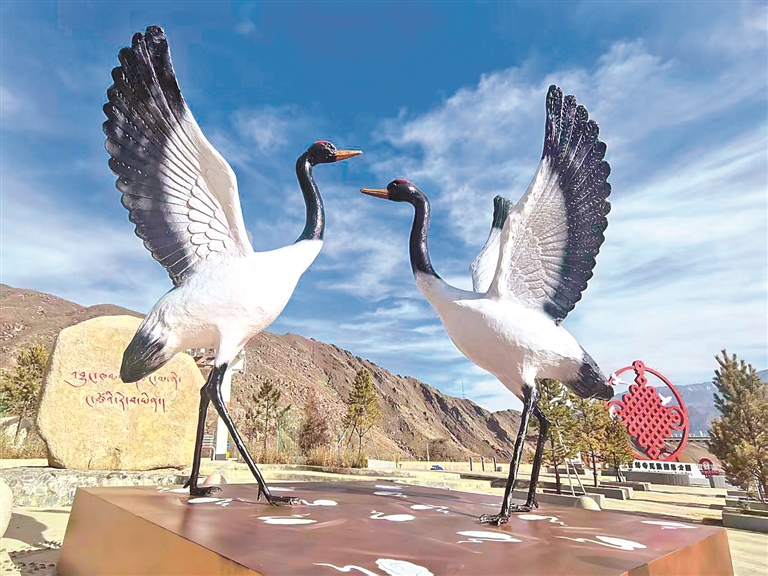 圖為哲蚌寺民族團結(jié)主題公園內(nèi)的拉薩市鳥黑頸鶴雕塑。