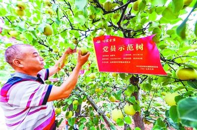 河南省洛陽市孟津縣會盟鎮(zhèn)鐵爐村萬畝梨種植基地內(nèi)的“黨員示范樹”。黃政偉攝/光明圖片