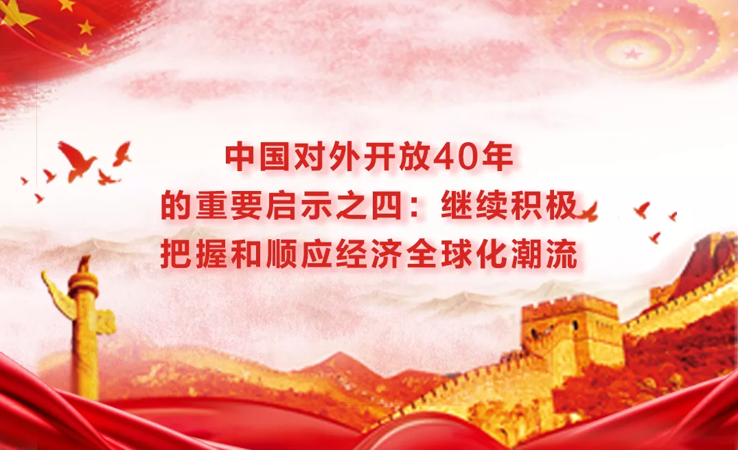 【編者按】經(jīng)濟全球化是不可逆轉(zhuǎn)的歷史大勢,為世界經(jīng)濟發(fā)展提供了強勁動力。改革開放40年,中國把握和順應(yīng)經(jīng)濟全球化歷史大勢,在開放中探索,在開放中奮進,逐步實現(xiàn)從“趕上時代”到“引領(lǐng)時代”的偉大跨越。在慶祝改革開放40周年之際,為了深刻總結(jié)中國對外開放40年重要啟示,中國理論網(wǎng)精心推出《繼續(xù)積極把握和順應(yīng)經(jīng)濟全球化潮流》一文,以饗讀者。