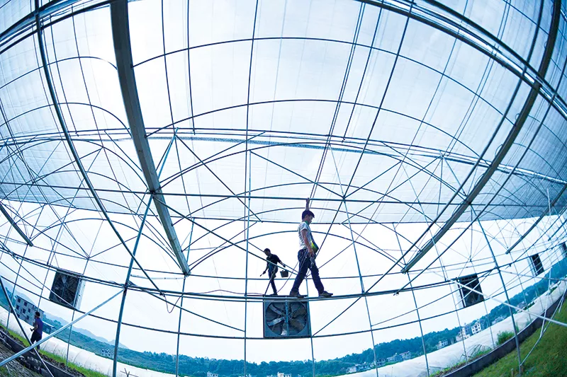 近年來,湖北省恩施土家族苗族自治州宣恩縣大力發(fā)展“設(shè)施農(nóng)業(yè)”,通過企業(yè)、合作社、家庭農(nóng)場等將農(nóng)民手中的土地進行流轉(zhuǎn),發(fā)展農(nóng)業(yè)觀光園和生態(tài)采摘園,為當(dāng)?shù)剞r(nóng)民開辟一條產(chǎn)業(yè)脫貧的新路。圖為宣恩縣李家河鎮(zhèn)二虎寨村,工人們在搭建溫控大棚。 新華社記者 宋文/攝