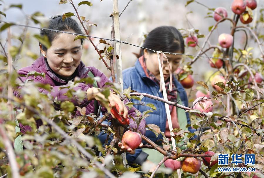 在林芝市米林縣羌納鄉(xiāng)西藏林芝現(xiàn)代蘋果標準化園區(qū),務工人員在采摘蘋果(11月22日攝)。新華社記者 張汝鋒 攝