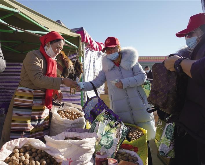 “這個小包好精致,太好看了?!钡┰龅臄偳皣@著一群人?!澳莻€最小號的包還有嗎?”“不好意思,都賣完了,您看看其他型號的吧。”來自林芝市朗縣的旦增已經(jīng)是第四次參加物資交流會了,此次物資交流會他不僅帶來了核桃、辣椒、蘋果等當?shù)靥厣a(chǎn)品,還帶來了牦牛皮制作的手工包。