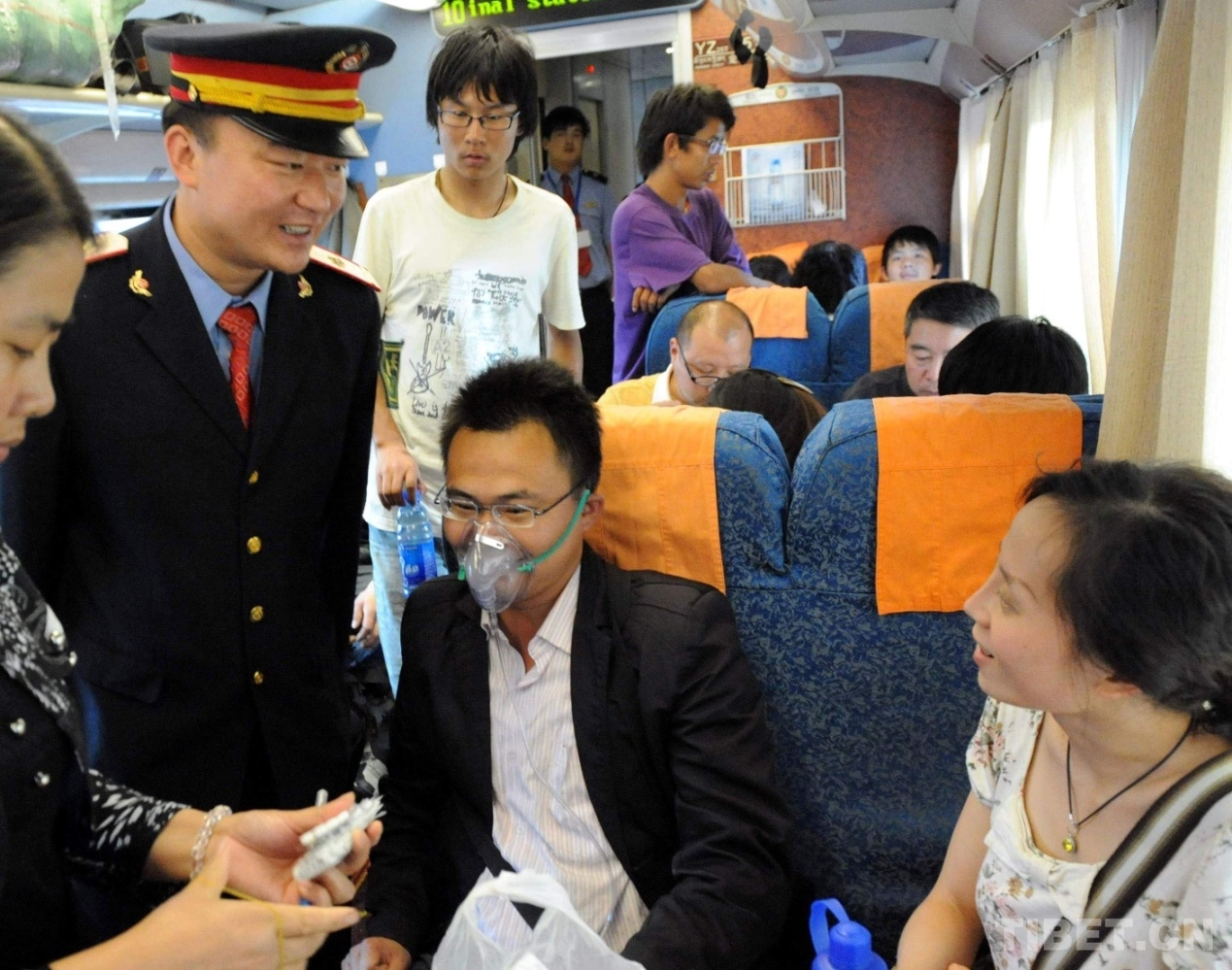 這是夫妻同在京藏列車上工作、被人們親切稱為“高飛的比翼鳥”的京藏車隊十一組列車長王寶山為身體不適的旅客送上氧氣面罩(唐召明2010年8月22日攝)