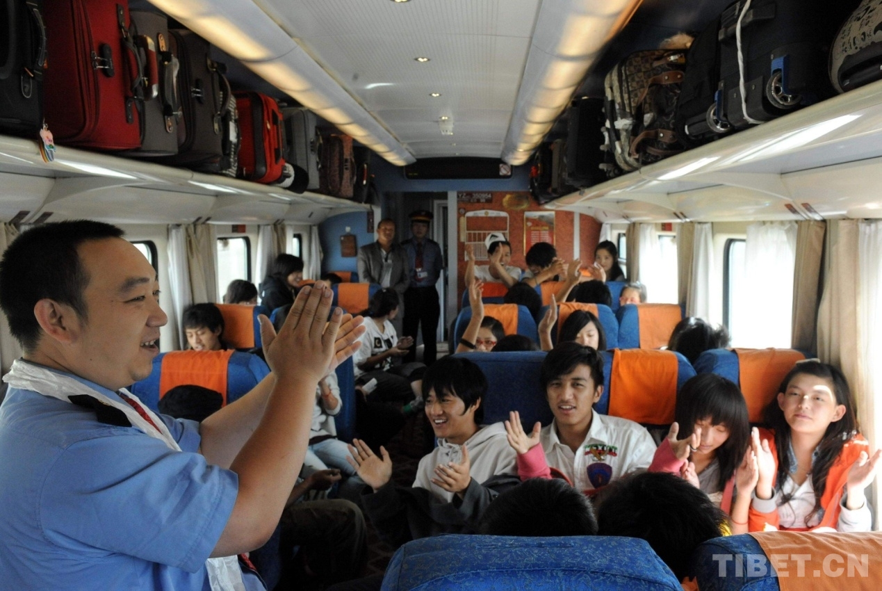 這是被稱為“快樂大叔”的共產(chǎn)黨員、硬座車廂乘務(wù)員鄭志剛在北京開往拉薩的京藏列車上,與藏族學(xué)生一起歡歌(唐召明2010年7月4日攝)