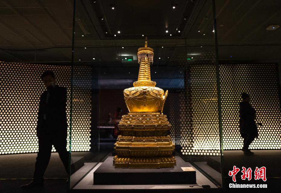 12月16日,“妙寶莊嚴(yán)——故宮博物院藏法器展”在北京嘉德藝術(shù)中心開展。113件從北京故宮博物院藏宮廷法器中精選出的展品首次大規(guī)模出宮展出。圖為“乾隆款銅鍍金嵌松石佛塔”展品。中新社記者 侯宇 攝