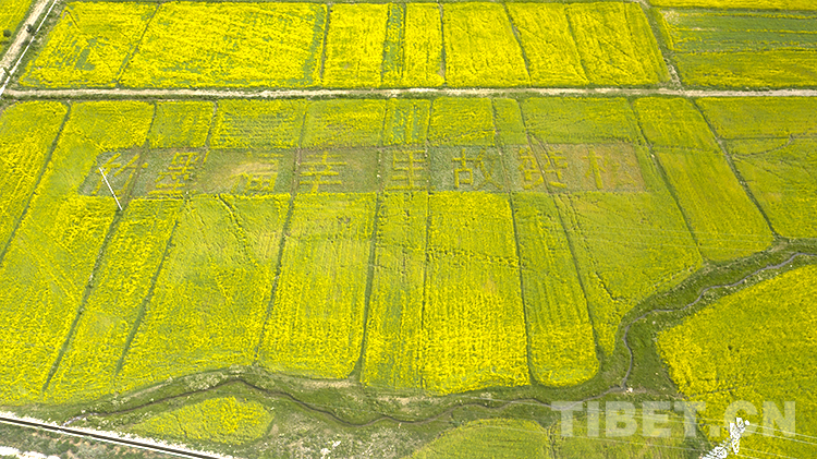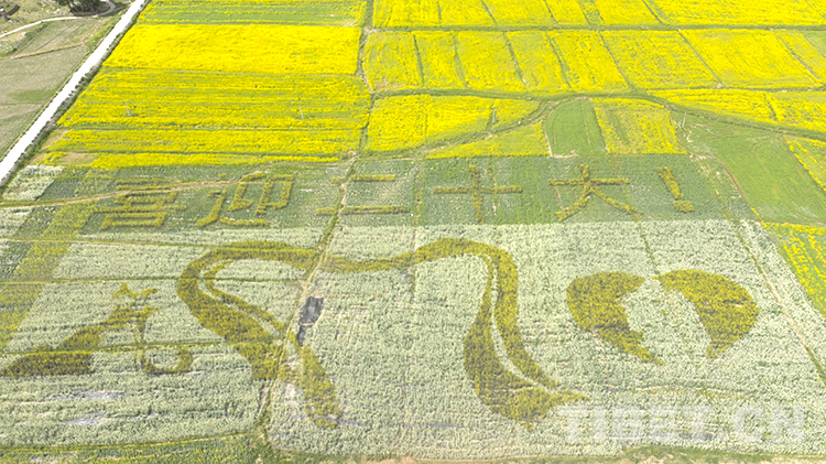 值得一提的是,在扎西崗鄉(xiāng)主會場,當(dāng)?shù)貙⒒牡刂匦麻_墾,安排種植了油菜花大地景觀。不同品種、不同顏色的油菜花海為背景的種植,從空中俯瞰形成了“喜迎二十大”“松贊故里 幸福墨竹”字樣和松贊干布、文成公主、哈達、愛心等圖樣,表達當(dāng)?shù)厝罕娤灿h的二十大的美好祝福。