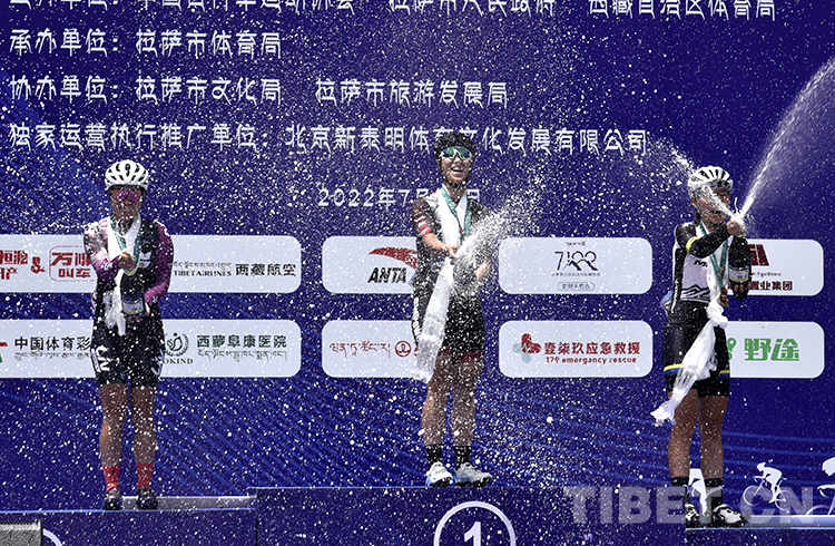 圖為7月23日,2022環(huán)拉薩城自行車大賽山地自行車女子公開組前三名高艷嬌(中)、何艷(左)、宋寒冰(右)在頒獎(jiǎng)儀式上開香檳慶祝 攝影:王媛媛