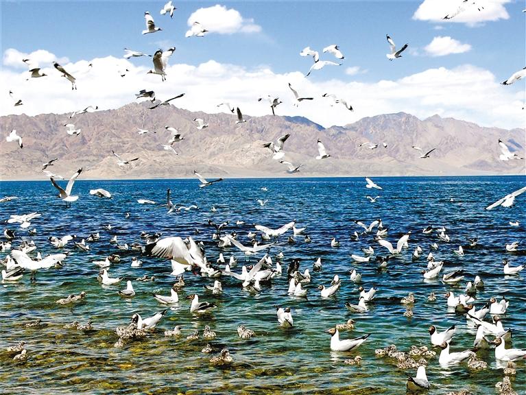 圖為水鳥(niǎo)嬉戲的班公湖。記者 洛桑旦增 攝