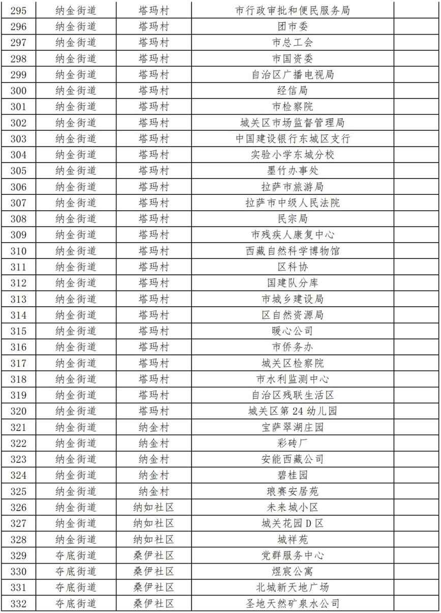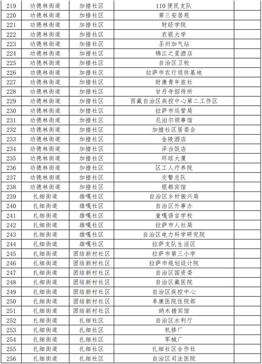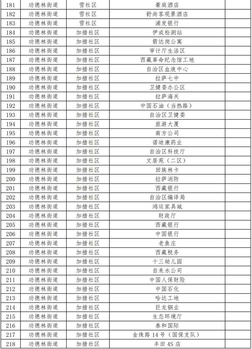17.功德林街道加措社區(qū)(伊成檢測(cè)站、箭達(dá)崗公寓、審計(jì)廳生活區(qū)、西藏革命紀(jì)念館工地、自治區(qū)血液中心、拉薩七中、衛(wèi)健委辦公區(qū)、拉薩海關(guān)、中國(guó)石油(當(dāng)熱路)、自治區(qū)衛(wèi)健委、旅游大廈、南方公司、諾迪康藥業(yè)、自治區(qū)科技廳、文居苑(二區(qū))、回族林卡、拉薩消防、西藏銀行、自治區(qū)編譯局、鴻運(yùn)家具城、財(cái)政廳、西藏銀行、中國(guó)銀行、老魚(yú)莊、西藏稅務(wù)、十三幼兒園、自來(lái)水公司、中國(guó)人保財(cái)險(xiǎn)、中國(guó)石化、哈達(dá)工地、巨龍銅業(yè)、生態(tài)環(huán)境廳、泰和國(guó)際、金珠路14號(hào)(國(guó)保支隊(duì))、豐田4S店、110便民支隊(duì)、第三安居苑、財(cái)經(jīng)學(xué)院、農(nóng)銀大學(xué)、圣州加氣站、錦江之星酒店、自治區(qū)衛(wèi)校、拉薩市農(nóng)行退休基地、財(cái)康青年旅社、甘丹寺招待所、西藏自治區(qū)疾控中心第二工作區(qū)、拉薩市運(yùn)管局、尼泊爾領(lǐng)事館、加措社區(qū)居委會(huì)、金陵酒店、澤當(dāng)飯店、環(huán)球大廈、區(qū)工人療養(yǎng)院、交警總隊(duì)、銀都賓館);