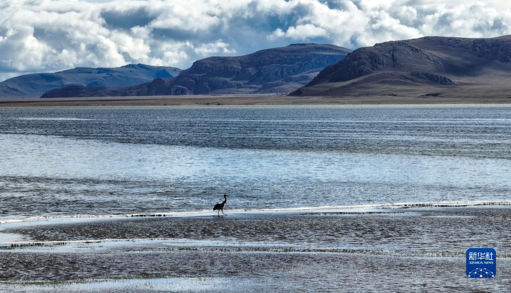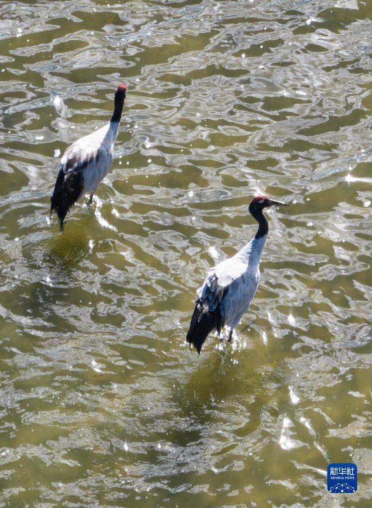 9月16日在多慶湖邊拍攝的黑頸鶴(無人機照片)。新華社記者 晉美多吉 攝
