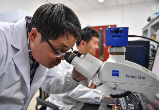 在西藏高原生物研究所,楊樂在實驗室中觀察動物標(biāo)本(3月2日攝)。新華社記者 晉美多吉 攝