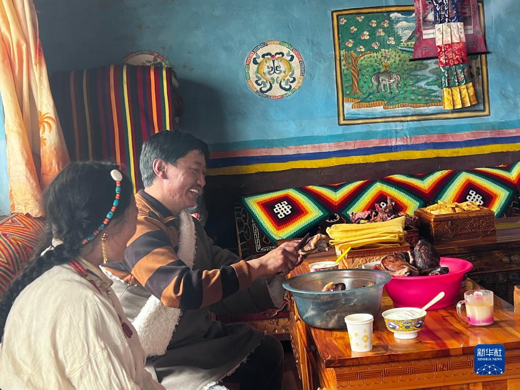 增措的丈夫娃布正在切肉(2023年3月8日攝)。新華社記者格桑邊覺 攝