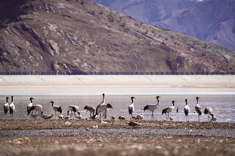 黑頸鶴是國家一級保護(hù)動物,在藏語中稱為“沖沖”。主要棲息在海拔2500米至5000米的高原、草甸、沼澤地帶。拉薩北部的林周縣平均海拔約4200米,是黑頸鶴的主要越冬地之一。最近這段時間,對拉薩市林周縣野保員們來說,一邊要忙自家的農(nóng)活,一邊還要巡查候鳥情況?!耙呀?jīng)有一小部分飛走了,估計再過半個月都會陸續(xù)飛走?!?月23日上午,野保員旦增告訴記者,在虎頭山水庫和卡孜水庫越冬的候鳥有一部分已經(jīng)飛走了。野保員口中的“飛走”便是遷徙,遷徙是候鳥的本能,一年一年,跟隨時間的召喚,完成兩次遷徙:繁殖和越冬。