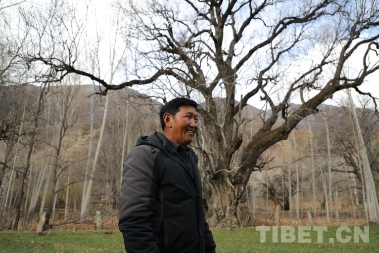 圖為熱果村黨支部書記達(dá)娃與身后的“糌粑拉姆”核桃樹 攝影:呂靜