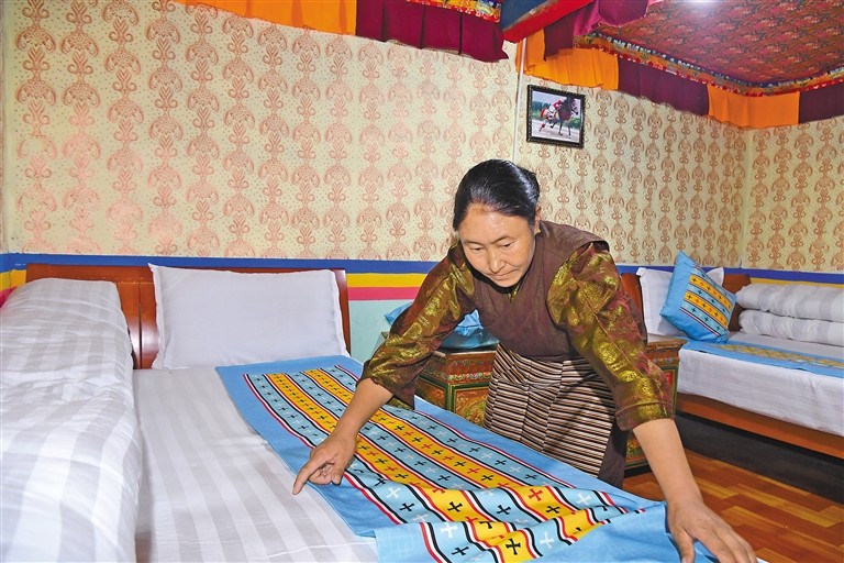 圖為瓊結(jié)縣強吉村的索朗曲珍在整理自家的民宿房間。記者 李洲 攝