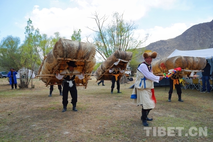 當(dāng)天恰好是周六,從拉薩來(lái)體驗(yàn)的游客不在少數(shù),有的是觀看了抖音直播就馬上騎車過(guò)來(lái)體驗(yàn)的。在營(yíng)地,大家欣賞到了當(dāng)?shù)氐摹肮挝琛保ㄅFご瑁斡蛇叧吿摹鞍帷焙蜕肀撑Fご璧摹按颉焙献鞅硌??!鞍帷笔枪挝柚械念I(lǐng)舞者,跳牛皮船舞時(shí),“阿熱”手執(zhí)“塔塔”(五彩旗桿),唱著歌,跳著舞,另外4位舞者看著“阿熱”的動(dòng)作,背著重約80斤的牛皮船,用同樣的動(dòng)作跟著“阿熱”跳舞。大家動(dòng)作整齊,船漿擊打船舷的“咚咚”聲不絕于耳。