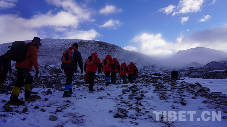 當天凌晨4點,西藏拉薩市當雄縣羊八井鎮(zhèn)周圍還是一片寂靜之時,參加洛堆峰登山探險活動的山友們已從羊八井高山訓(xùn)練基地出發(fā)前往洛堆峰登山探險。經(jīng)過長達7小時30分左右的長途跋涉,第一批登山人員成功登頂海拔6010米的洛堆峰,此時金色的太陽早已籠罩大地,白皚皚的雪山聳立在大地之上,在陽光的照耀下顯得格外壯觀。
