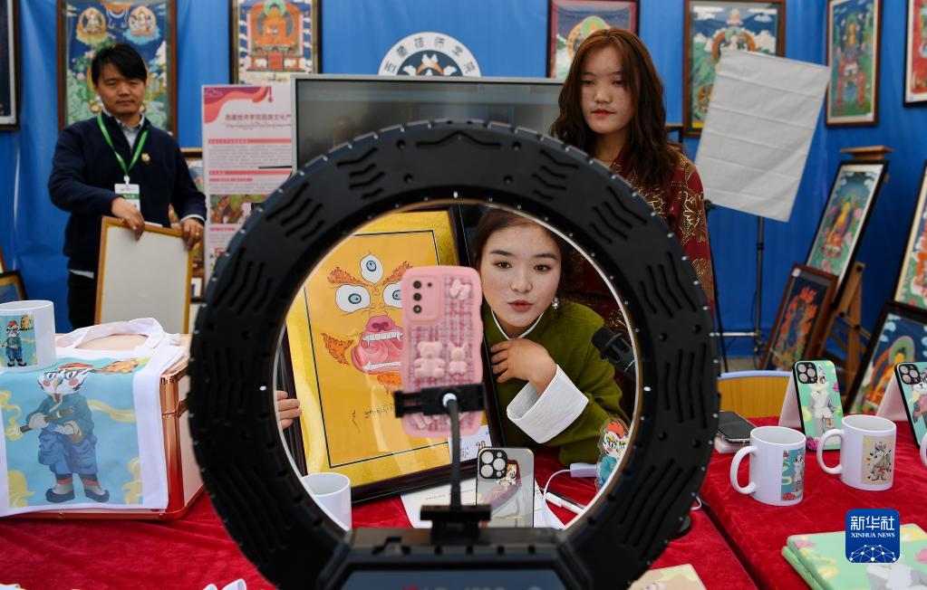 5月10日,西藏技師學(xué)院學(xué)生直播展示師生制作的手工藝品。新華社記者 張汝鋒 攝