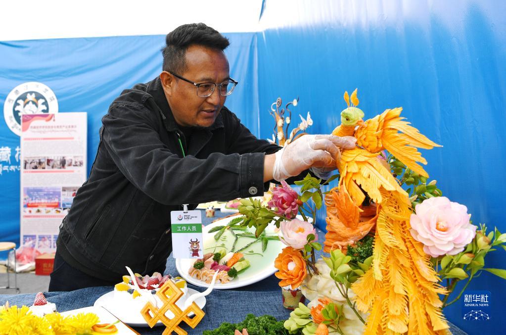 5月10日,西藏技師學(xué)院一名老師擺放食品雕刻藝術(shù)作品。新華社記者 張汝鋒 攝