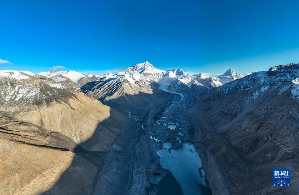 這是珠峰腳下的中絨布冰川(前)和西絨布冰川(后)(5月15日攝,無人機(jī)照片)。新華社記者 孫非 攝