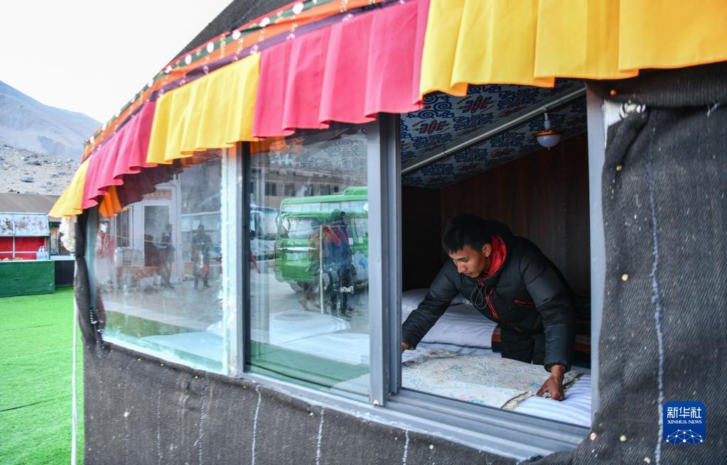 在珠峰游客大本營的帳篷旅館,旦增在整理床鋪(5月13日攝)。新華社記者 孫非 攝