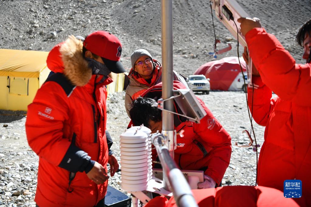 在珠峰登山大本營附近,第二次青藏科考高海拔氣象梯度觀測小組負(fù)責(zé)人趙華標(biāo)(中)在指導(dǎo)科考登頂隊隊員架設(shè)自動氣象站(5月9日攝)。新華社記者 晉美多吉 攝