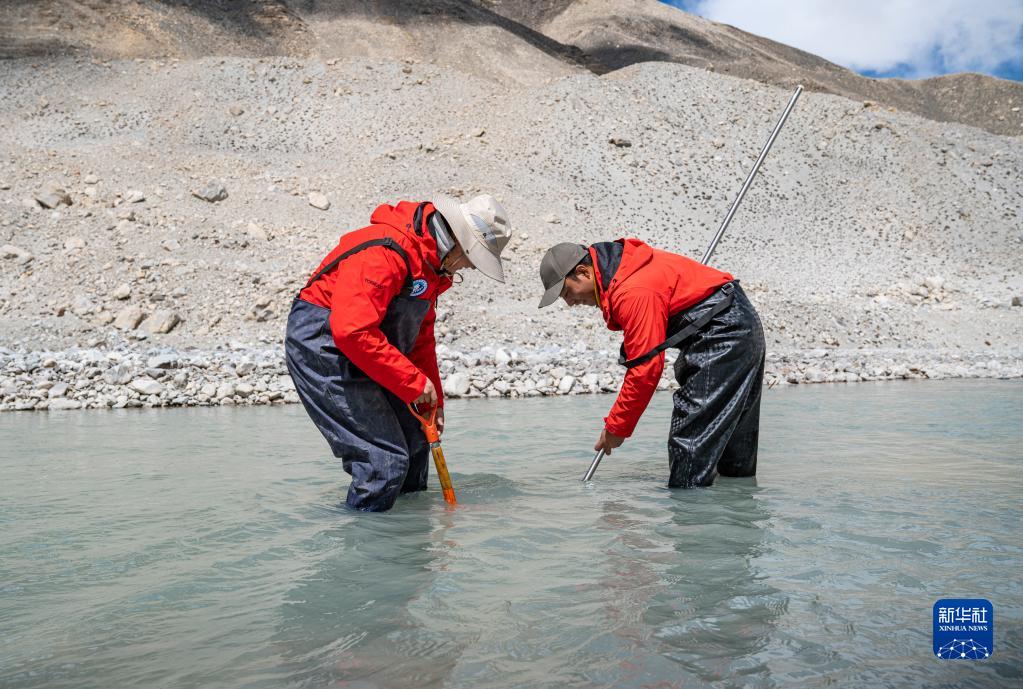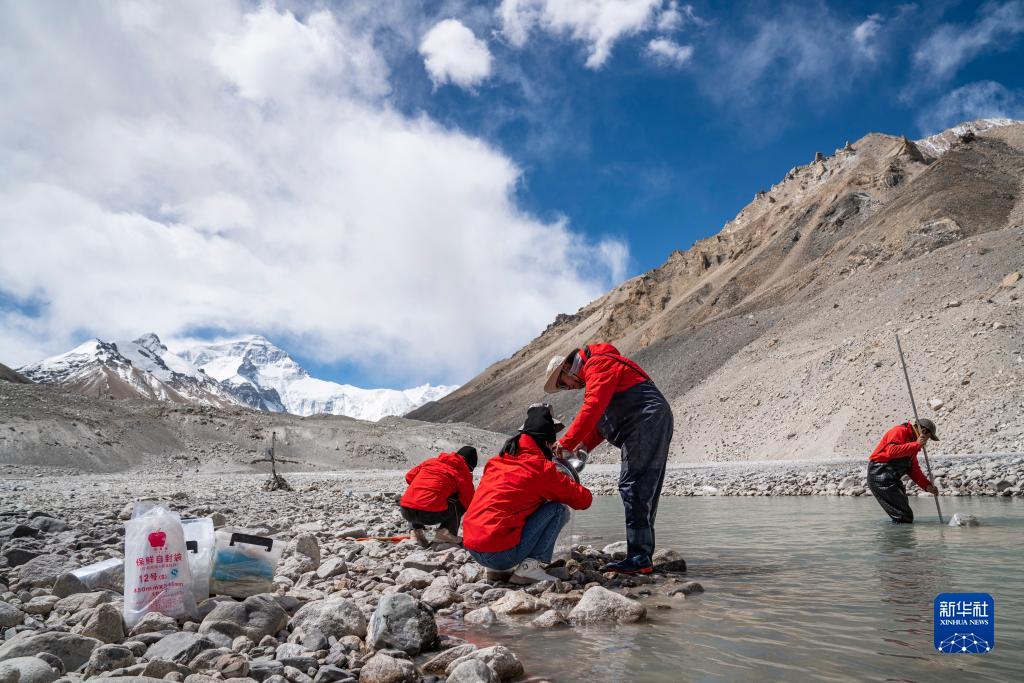 在珠峰登山大本營附近,來自西藏大學(xué)生態(tài)環(huán)境學(xué)院的科考隊員在進(jìn)行水生態(tài)調(diào)查(5月22日攝)。新華社記者 孫非 攝