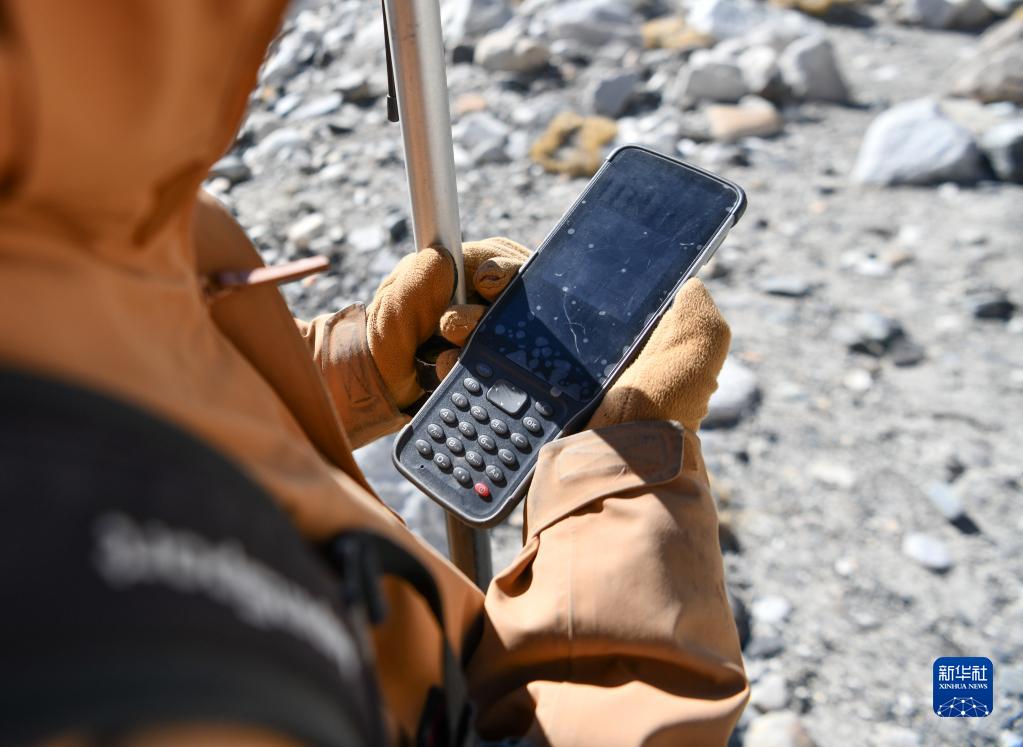 在珠峰海拔約5300米處,來自中國科學(xué)院西北生態(tài)環(huán)境資源研究院的科考隊員薛雨昂在對冰川進(jìn)行實時差分GPS定位(5月15日攝)。新華社記者 晉美多吉 攝