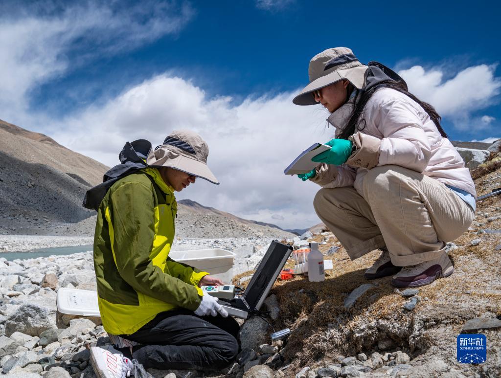 在珠峰登山大本營附近,來自西藏大學(xué)生態(tài)環(huán)境學(xué)院的科考隊員在測量土壤溫度(5月22日攝)。新華社記者 孫非 攝