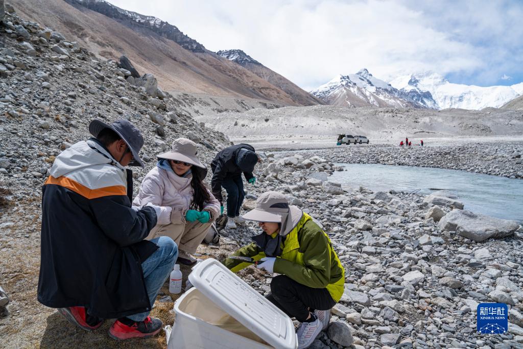 在珠峰登山大本營附近,來自西藏大學(xué)生態(tài)環(huán)境學(xué)院的科考隊員在采集水生生物樣本(5月22日攝)。新華社記者 孫非 攝