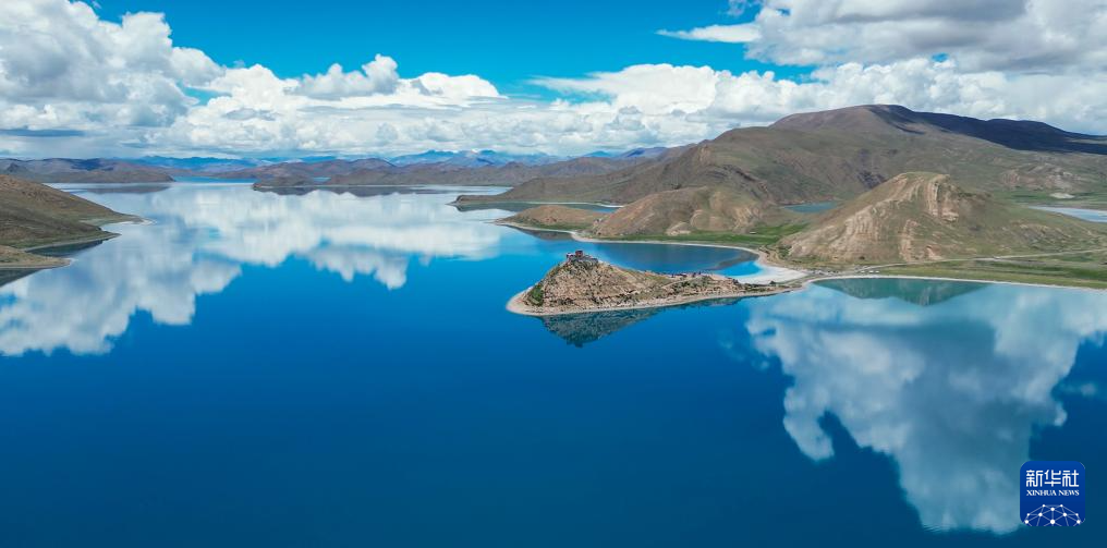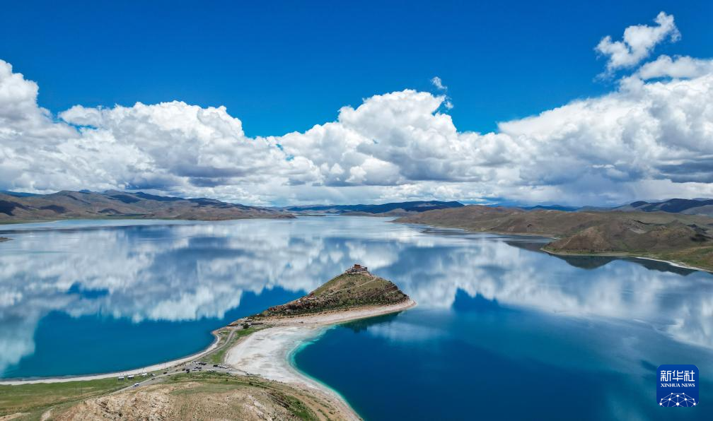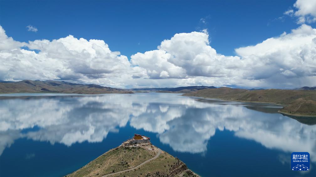 坐落于羊湖北岸一座半島上的日托寺(無人機照片,7月22日攝)。新華社記者 聶毅 攝