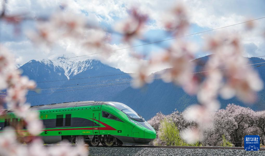 C881次高原復(fù)興號(hào)動(dòng)車組沿著拉林鐵路穿行于雪山峽谷之間,車窗外可以同時(shí)看到雪山與桃林。新華社記者 丁增尼達(dá) 攝