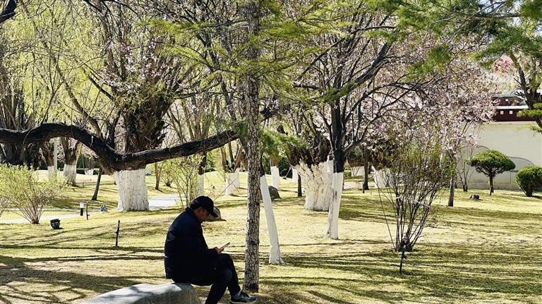 在拉薩,賞花從不必刻意尋找景區(qū),許多街道便藏著盎然春色。四月的拉薩城西,也有著令人目不暇接的美好。八一路、羅堆西路、羅布林卡路一帶,除了常見的榆葉梅、紫葉李等,還藏著拉薩不常見的海棠花,此時的海棠花在綠葉的襯托下開得正艷。陽光灑下,花朵和葉子的顏色飽和度極高,微風(fēng)拂過,花瓣輕柔飄落,不少路人紛紛停下拍照,將明艷的春色收進自己的手機。