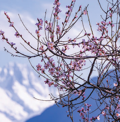 盛開的桃花與遠處的雪山相映成景。圖為記者徐馭堯攝