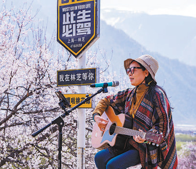 游客在桃花節(jié)現(xiàn)場即興彈唱。圖為記者徐馭堯攝